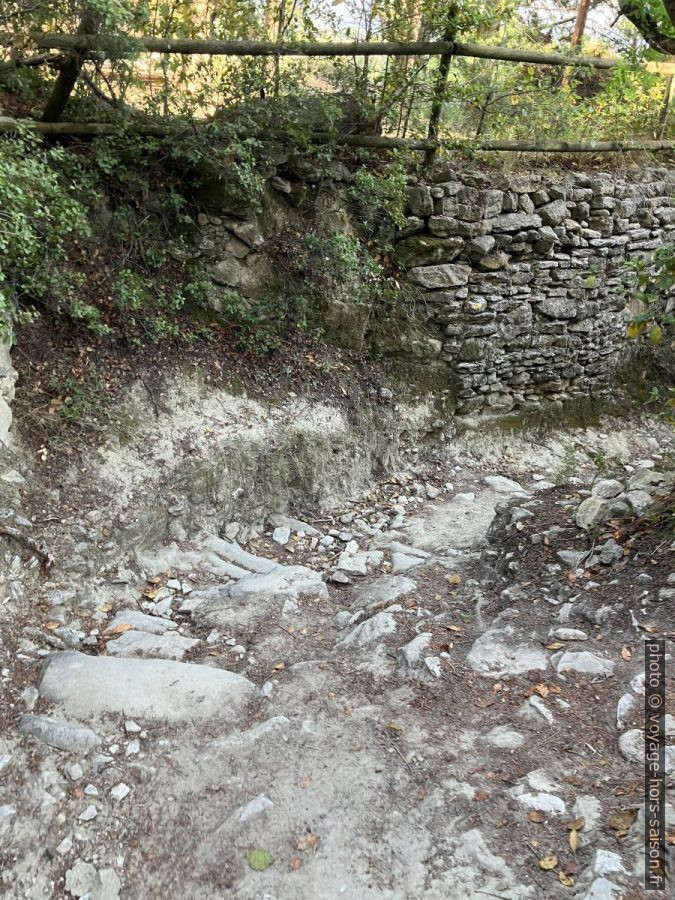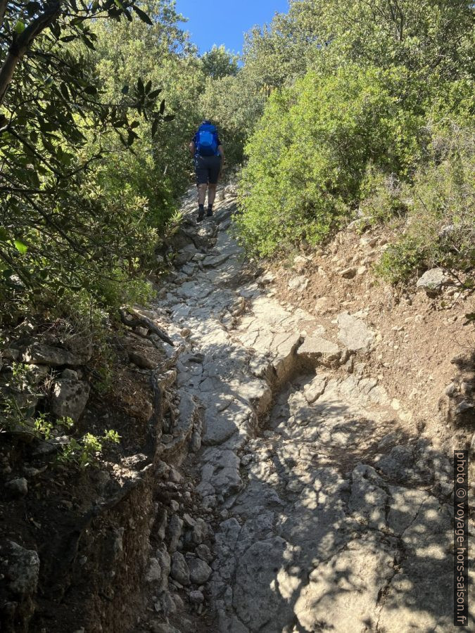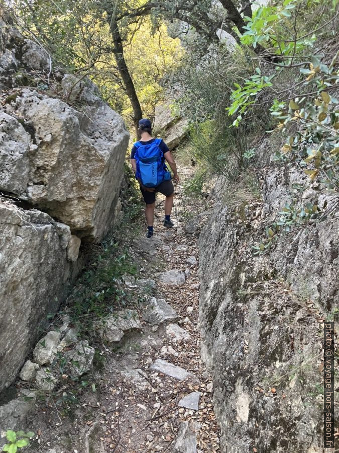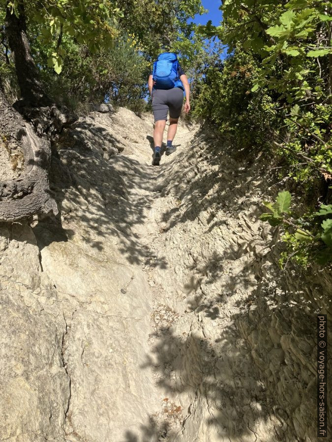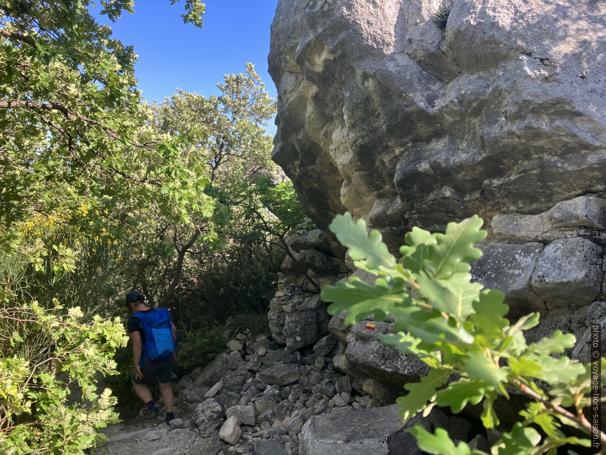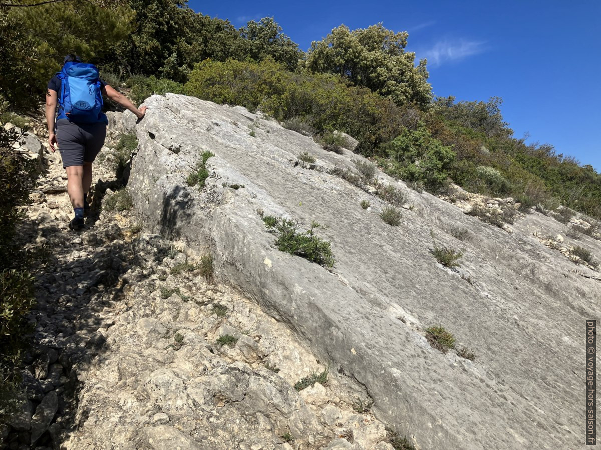La forge ne se trouve qu’à la moitié de la montée. Il reste du chemin. On passe progressivement entre beaucoup de grandes dalles calcaires.