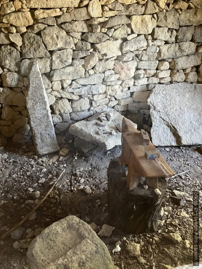 Au milieu du chemin se trouve un cabane relevé il y a quelques années. Un panneau tout près porte encore la photo qui ne montre que les murs de base. Il s’agit de la forge pour aiguiser et réparer les outils de la carrière de pierres de construction qui se trouve plus loin à l’ouest dans le versant. Elle est placée ici pour être loin des habitations et aussi de la carrière pour que son feu ne se propage pas dans les habitations et les exploitations.