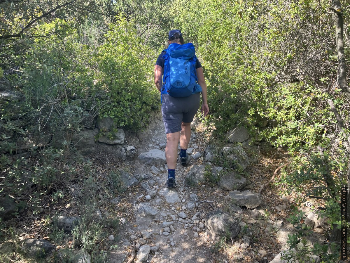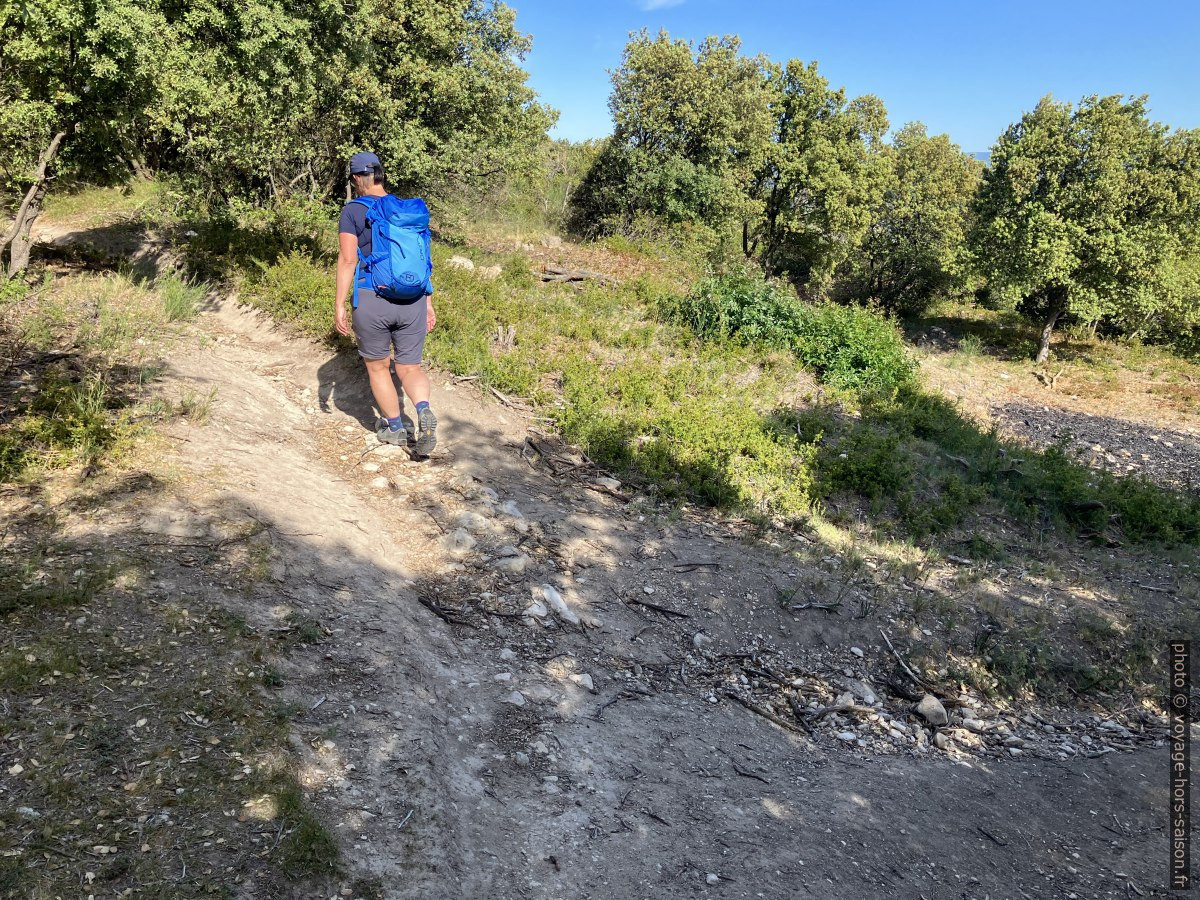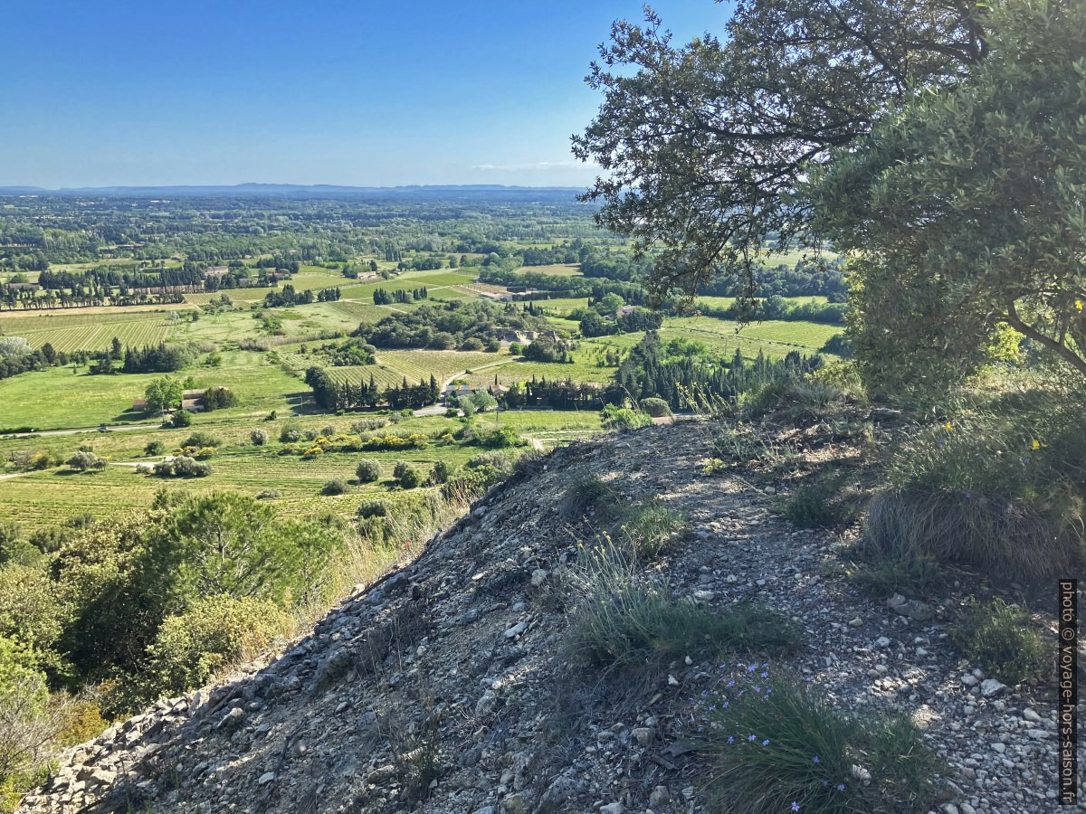On aime des randonnées qui partent directement du centre-ville ou du centre d’un village. C’est faisable à partir de Beaumes-de-Venise en montant sur le Plateau des Courens. On est au mois de mai, les journées sont longues et belles et on part donc après 16 heures. On sera de retour trois heures après parce que nous prenons beaucoup de temps. C’est une des randonnés sélectionnés pour notre site provençal, on l’y trouve sous le nom de Beaumes-de-Venise et le Plateau des Courens avec toutes les informations nécessaires pour ce tour.
